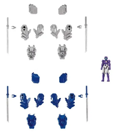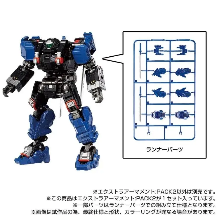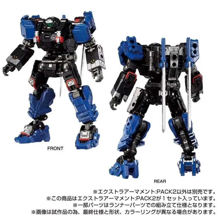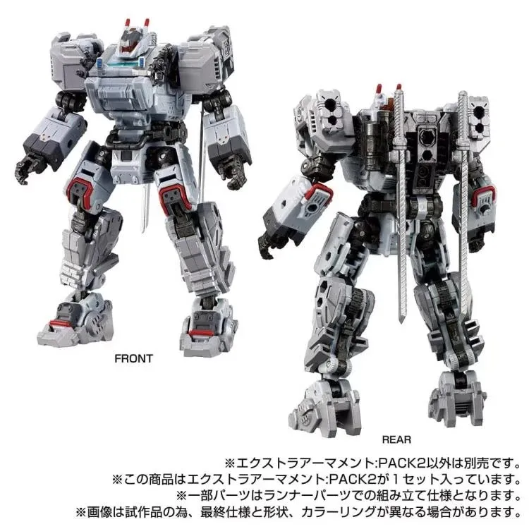 The set includes shoulder-mounted parts, foot-mounted parts and weapons in new coloring! One Diaclone female member is included. The mounting and weapon parts are assembled with runner parts.