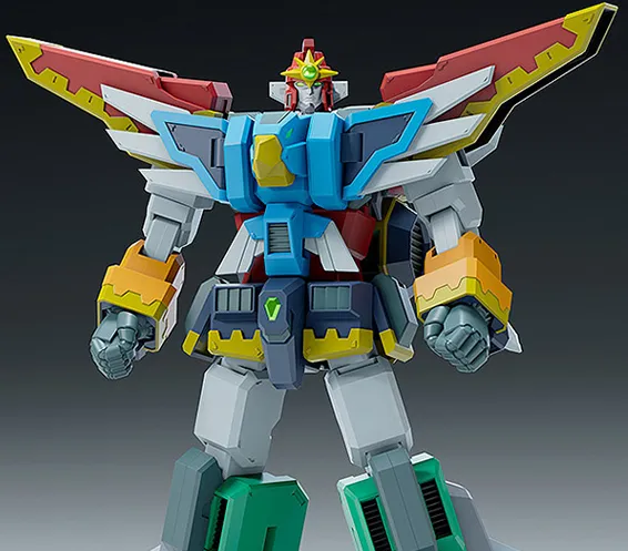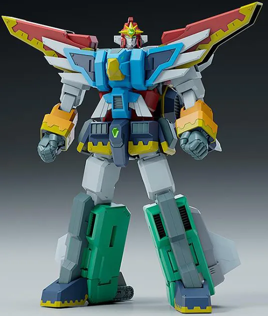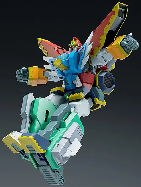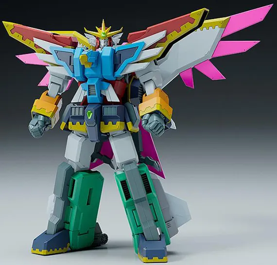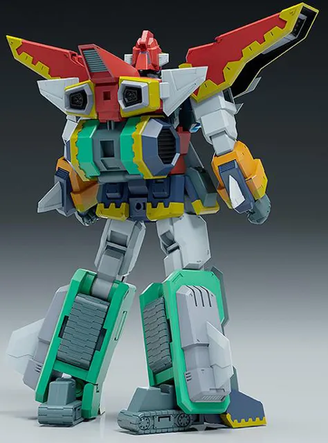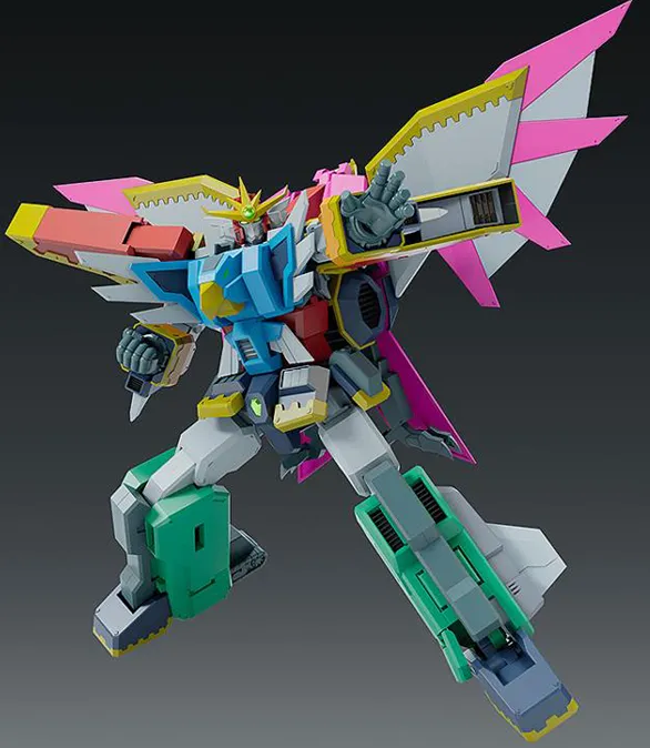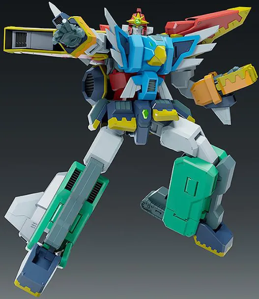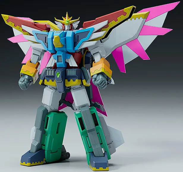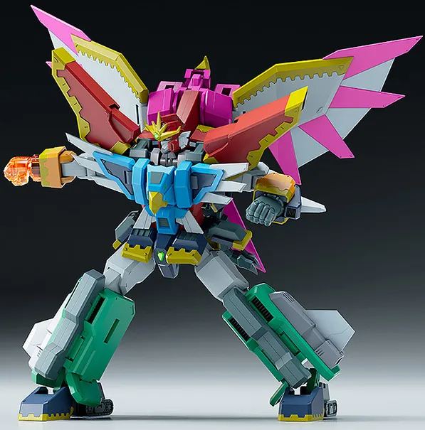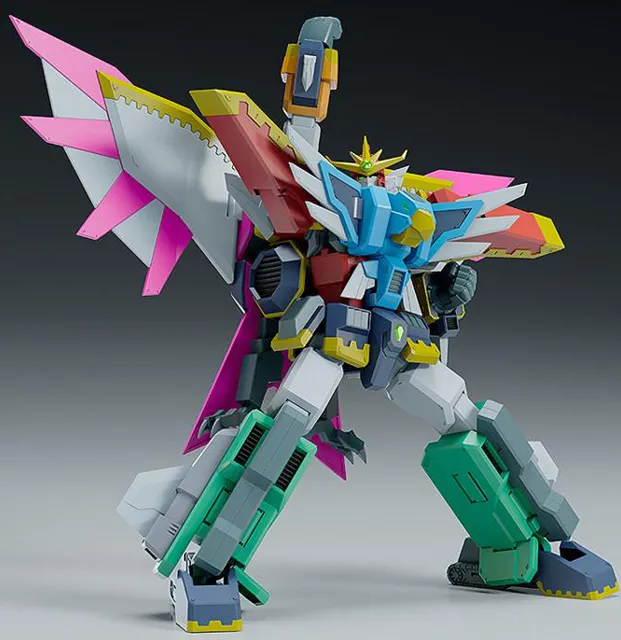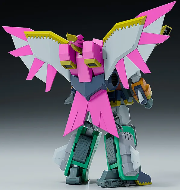 The El Dora V from 'Gun x Sword' is making its plastic model debut in the MODEROID series! · The model stands at about 200mm in height. Joints of the model are articulated. All five mecha—Grand Header, Body Gander, Power Hander, Nice Footer and Pink Amigo—can be combined to create El Dora V! Interchangeable parts for Body Gander's head and Pink Amigo's wings are included to create a look even closer to the anime series.