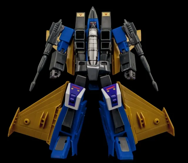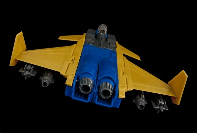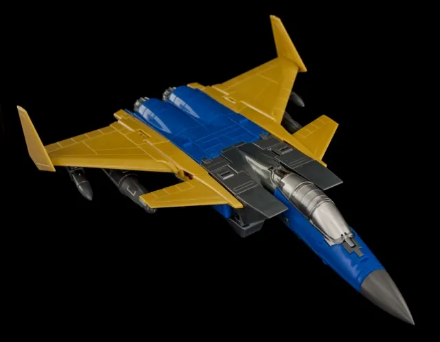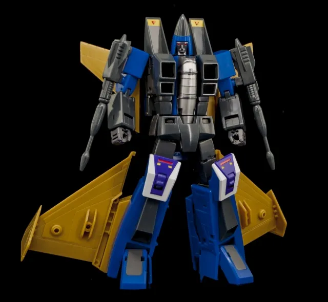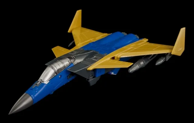 Standing tall in approximately Masterpiece scale, the 3rd party figure is packed with detail all the way from the cone of his head to the tips of his wings. His color scheme—gunmetal gray and blue with yellow/gold wings—is reflective of a classic 80s cartoon style. Well sculpted features reveal amazing detail, while the figure's construction demonstrates a professional level of precision engineering and design. Everything from the figure's legs to his fingers are fully articulated, with a wide range of movement and poses.