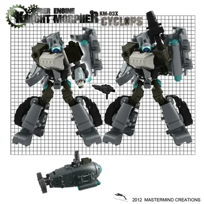 KM-03X Mirroverse Cyclops Limited Edition Holiday Exclusive is a Knight Morphe figure that is approximately Voyager Class Scale, stands 3.5-inches tall in robot mode and transforms from Submarine to robot and back. This limited edition holiday exclusive from Mastermind Creations features the Mirrorverse alternate reality version of the KM-03 Mini-Sub! Features a color scheme unique to this figure, alternate arm & weapon, & comes in its own unique packaging.