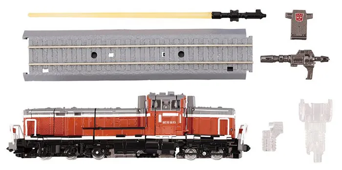 The diesel locomotion DE10 is completely transformed into a robot; he can be displayed on the included rail base, and his weapon Power Laser is included, as is the Light Sword for Raiden. In addition to transforming from robot to train and back again, Kaen also transforms into the mighty Raiden's waist!