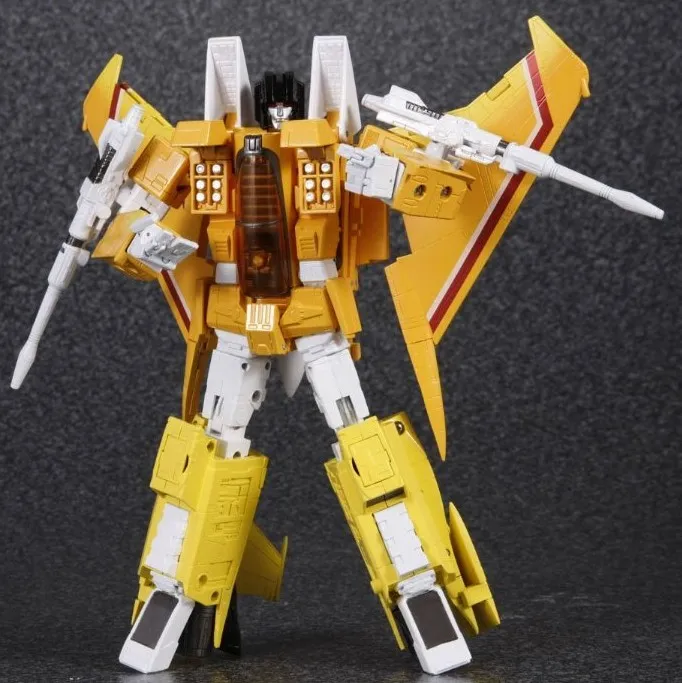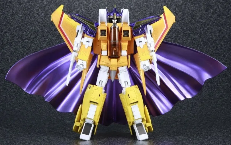 This highly sought after repaint of MP-11S Sunstorm figure for the first time ever features a much more G1 Transformers cartoon accurate color scheme. MP-11S Sunstorm colors replicate his color layout as seen in his cartoon appearance, with white arm blasters, biceps, fists, and shoulder intakes. He also includes Starscream's legendary Coronation Crown, Cape and Pauldrons, as well as a metallic silver pilot mini-figure that can fit in Sunstorm's cockpit.