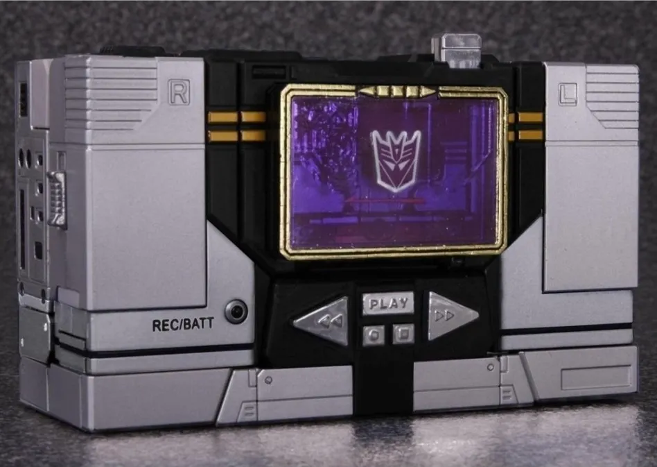 The original G1 Soundblaster toy is fondly remembered for its unique ability to transform into an awesome cassette player and back to sinister robotic form. Soundblaster was originally D-101 and only available in Japan and featured as a reincarnated and more sinister version of Soundwave that appeared in the Japanese Headmasters series. He features not only a darker color scheme but also a purple tape deck door and includes for the first time Masterpiece Ratbat available only with this figure.