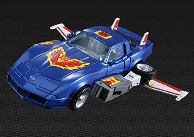 Transformers Masterpiece MP-25 Tracks is an officially-licensed Chevrolet Corvette C3 from 1980-82 and includes both Raoul and a mini non-transforming blaster accessory. Additionally he includes a flight stand that allows collectors to display Tracks for the first time ever his alternate flight mode. Additionally his rockets can attach below his flight mode for his alternate fan version of his flight mode.