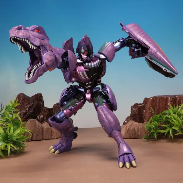 As he towers above all the other creatures of the forest in full Masterpiece scale, MP-43 Megatron transforms into a terrifying, fearsome Tyrannosaurus Rex! The alt mode not only looks amazing, but maintains show accuracy in both design and execution. In robot mode, MP-43 Megatron looks sleek and futuristing, with one of his hands even doubling a T-Rex mouth.