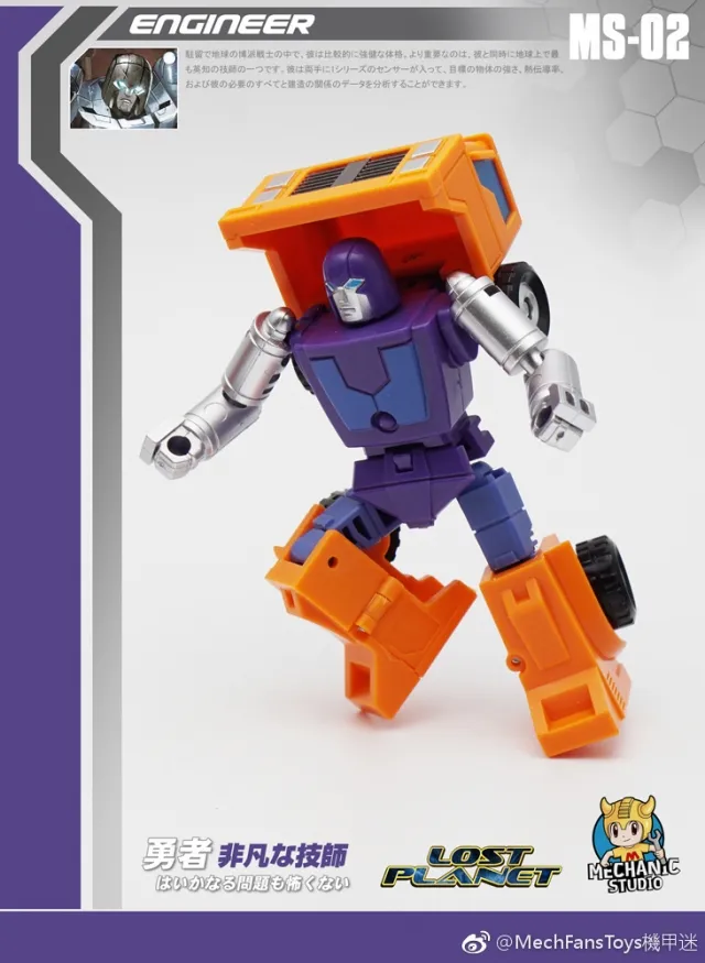 Mechanic Studios MS-02 Engineer stands 10.16 CM/4" tall in robot mode and 7.62 CM / 3" long in car mode and is approximately 1/48 scale. Engineer transforms from a truck to robot and back. Figure includes a handgun as shown.