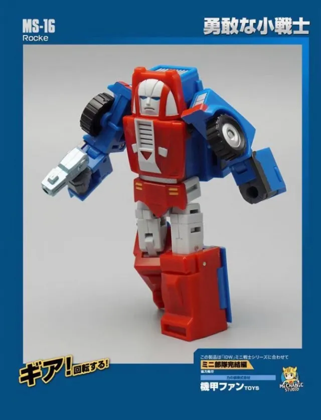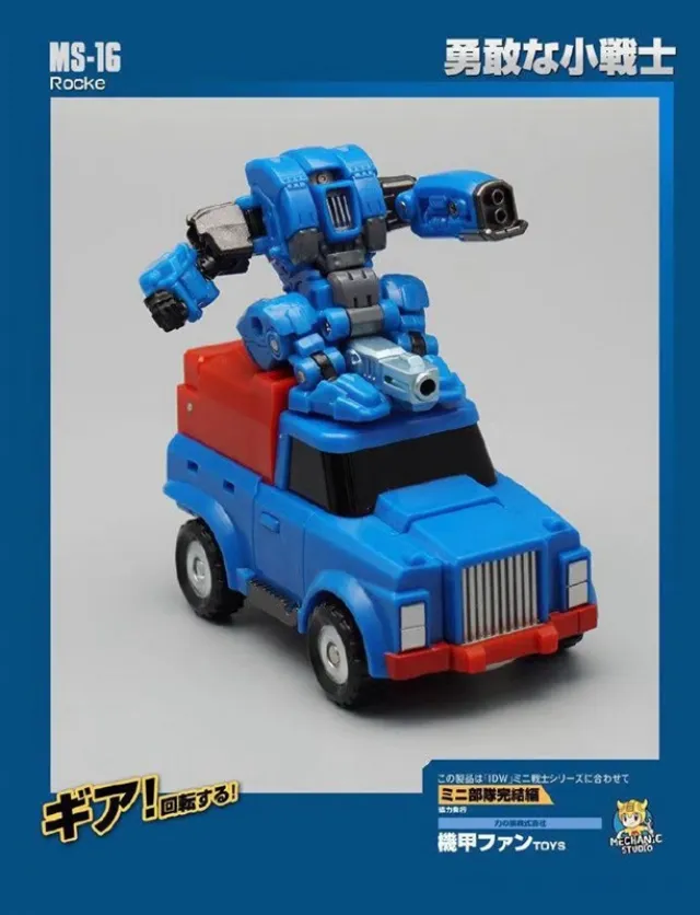 Mechanic Studios MS-16 Rocke stands 7.6 CM/3" tall in robot mode and 8.4 CM / 3.3" long in car mode and is approximately 1/48 scale. Rocke transforms from a truck to robot and back. Figure includes a handgun as shown.
