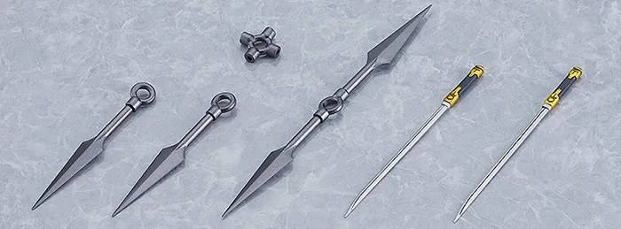 Bakuretsumal comes with two swords and a kunai. The kunai can be connected to the swords with dedicated parts and also to create its shuriken state. Bakuretsumal comes with open hand parts and an interchangeable open hand part for holding the shuriken. Bourus comes with a mace and a shield.