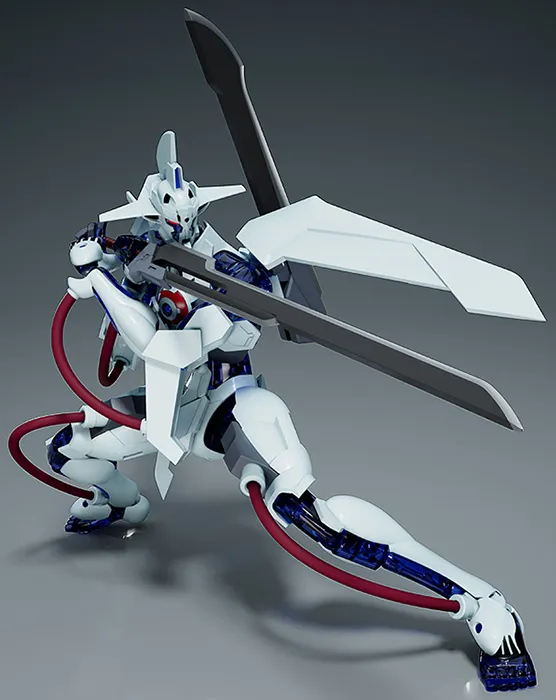 The model stands at approximately 190mm in height and comes with its sword and interchangeable hand parts. Translucent parts have been used to create the G-ER fluid sections of the mecha. The cables at the arm and leg areas of the mecha are made with flexible parts, allowing for a wide range of articulation while still preserving the unique looks of the mecha. The included sword can be separated into a large sword and small sword, and it can also be attached to the forearm of the mecha using the included attachment parts.