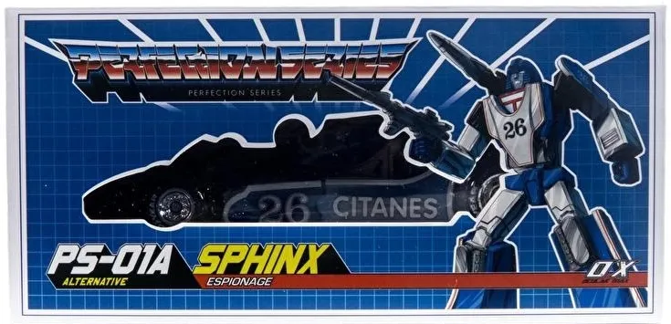 PS-01A Sphinx Alternative is a Masterpiece Scale Scaled figure manufactured by Mastermind Creations and part of their Ocular Max sub-brand. PS-01A Sphinx Alternative is part of the Perfection Series toyline, he stands 6.5-inches tall and transforms from a robot to Race Car and back.