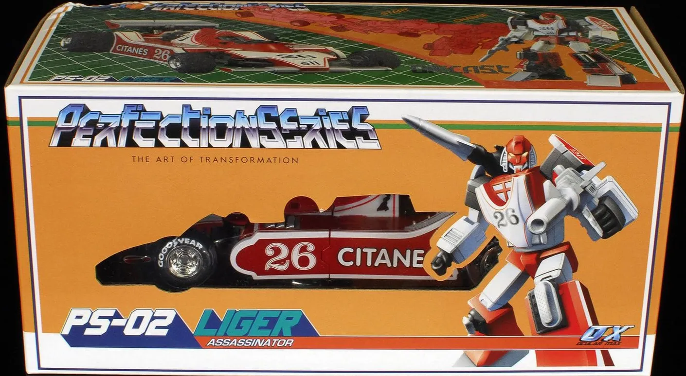 PS-02 Liger is a Masterpiece Scale Scaled figure manufactured by Mastermind Creations and part of their Ocular Max sub-brand. PS-02 Liger is part of the Perfection Series toyline, he stands 6.5-inches tall and transforms from a robot to Race Car and back.
