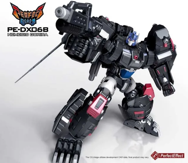 PEDX06B Nemesis Gorira by Perfect Effect stands 25CM/10" tall in robot mode and is made of PC-ABS and die-cast parts. Nemesis Gorilla is a recolor/remold of PE-DX06 Beast Gorira featuring an all new color scheme. Figure transforms into four distinct modes and towers above MP-32 Masterpiece Optimus Primal!