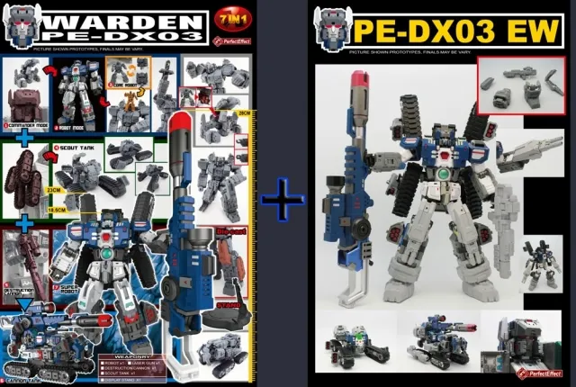 This mighty Transformable Robot can form the battle tank as well as transform into a head for Fortress Maximus! Note: this set includes both PE-DX-03 Warden & PE-DX03EW Warden Add-on parts.