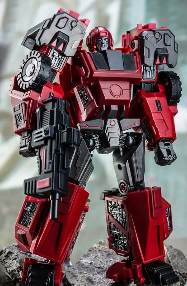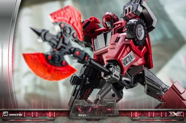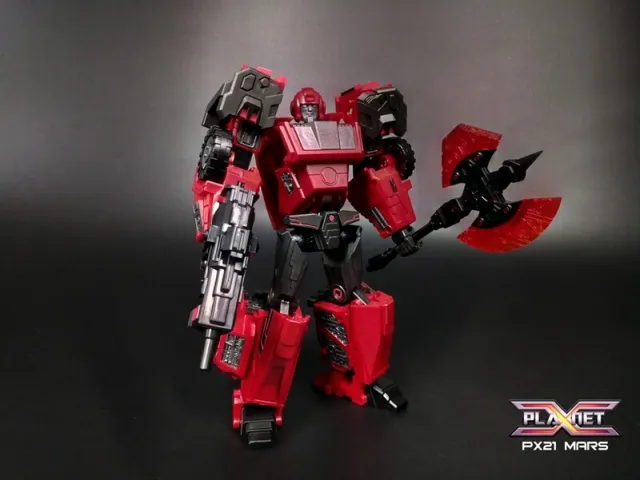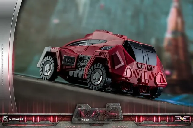 Planet X's PX-21 Mars is made of durable plastic and features a high level of articulation and is highly posable. The figure is built to a high standard and meticulously precision engineered to the Planet X's standards. PX-21 Mars is a Deluxe Class scale figure—standing 4.3-inches tall in his robot mode and can quickly transform between a Armored Truck and robot and back.