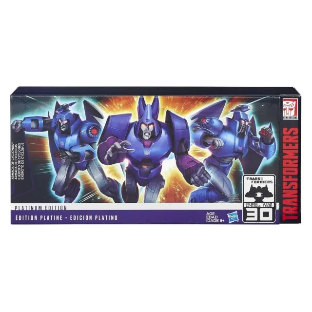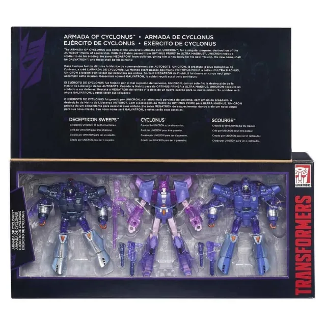 Hasbro's Armada of Cyclonus set commemorates the 30th anniversary of the Transformers movie and includes three great Transformers G1 movie figures recolored in this giftset. Cyclonus is a redeco of the 2008 Transformers Universe figure featuring transparent plastic on several parts which is nostalgic to his reformation in the movie. Scourge is a redeco of his Generations Deluxe Class toy, featuring transparent plastic on several parts to evoke his reformation in the movie. Decepticon Sweeps" is also a retool of Generations Scourge and features a pre-tooled alternate head based on Devcon.