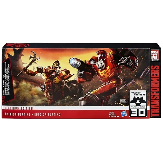 Planet of Junk Clash set of 3 figures is part of the Transformers Platinum Edition line and commemorates the 30th anniversary of Transformers the movie. Included in this amazin set is one deluxe scale Autobot Hot Rod, deluxe scale Wreck-Gar and deluxe scale Junkion Scrap Heap.