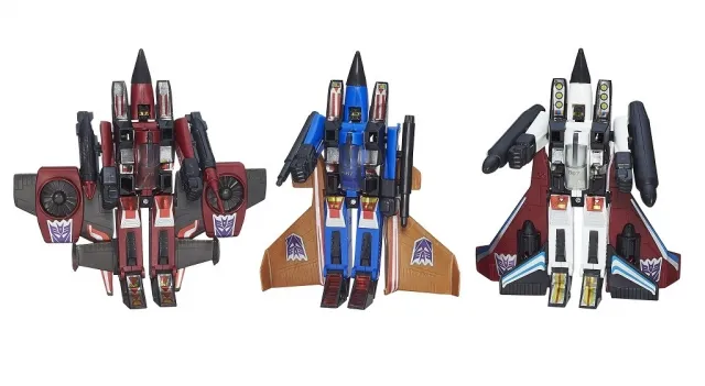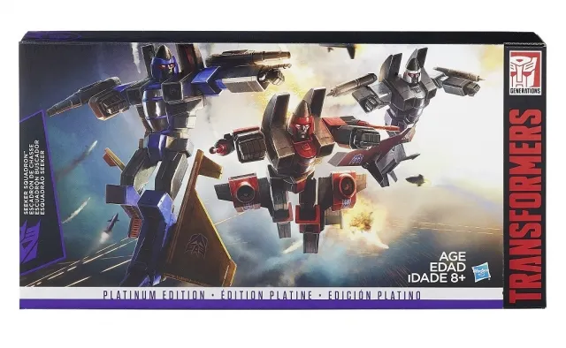Transformers G1 Reissue Ramjet, Thrust and Dirge seeker jet set brings the infamous cone head trio back in all of their Transformers G1 glory. Included in this set are all three seeker jets, in exclusive Platinum Edition packaging. Each transforms from robot to jet and back and includes all the original parts from their original Transformers G1 release.