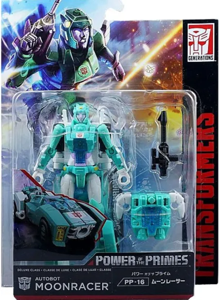 Transformers Generations Power of the Primes Deluxe Class figures are 5.5-inch-scale figures that come with a Prime Armor accessory. Insert a Prime Master figure (not included; each sold separately) into the accessory, attach it to the figure, and imagine Autobot Moonracer wielding the power of a Prime. The robot action figure also comes with a blaster accessory. The Deluxe Class Autobot Moonracer figure converts between robot and sports car mode in 14 steps. Combine it with other Power of the Primes figures -- 3 Deluxe Class and 1 Voyager Class -- to form a giant Combiner super robot (additional figures each sold separately).