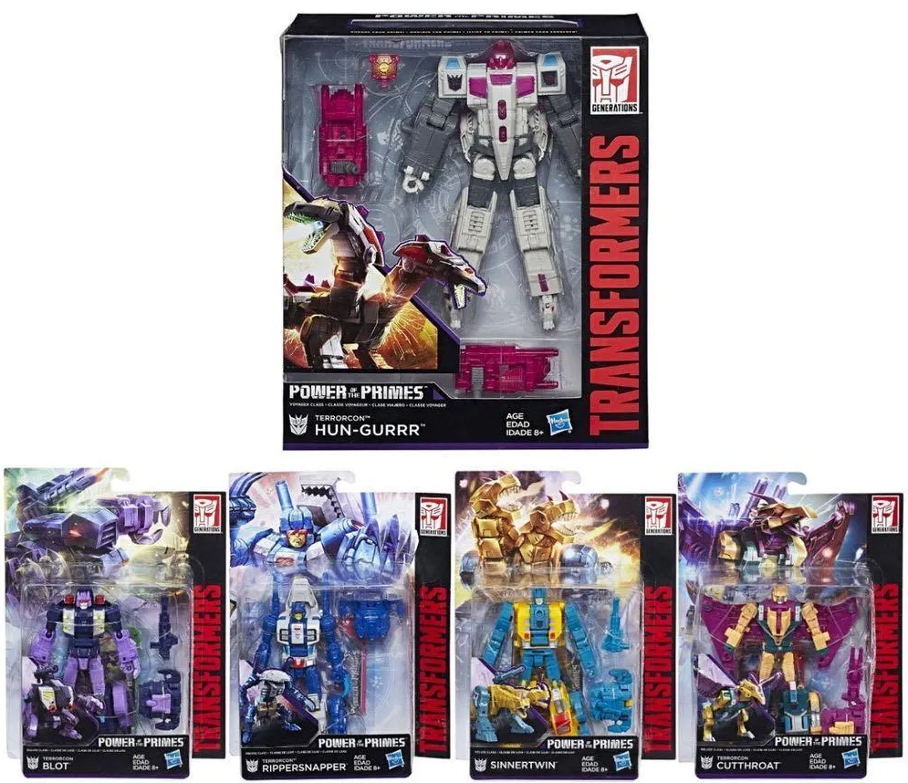 Transformers Power of the Primes - Abominus - set of 5 set includes Voyager Class Hun-gurrr and the four terrorcons: Cut-throat, Blot, Rippersnapper and Sinnertwin! The 7-inch scale Hun-gurr and 5.5" deluxe figures convert from robot to beast and combine to form a menacing Abominus figure! The Predaking Combiner stands 14 inches tall. Combined robot stands 14-inches tall. The Autobots and Decepticons use Prime Masters to wield the incredible powers of the legendary bots who shaped the universe: the Primes. Anything is possible and everything is at stake when the Power of the Primes is unleashed!