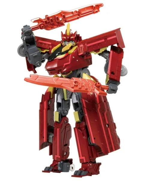 From the animated series Shinkansen Henkei Robo Shinkalion, this figure is composed of 3 separate train cars. The front and end train cars combine to create the robot mode for Kurenai, while the middle car opens up to store his weapon and crown accessories.