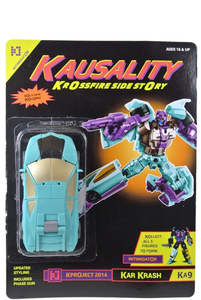 Kar Krash by Fansproject stands approximately 4.5-inches tall in robot mode and is part of Fansproject's Kausality Series of figures. Kar Krash is part of Fansproject's Intimidator combiner toy series, which features 5 race themed transforming robots that also combine together to fom the mighty Intimidator. Each of the 5 figures is sold separately.