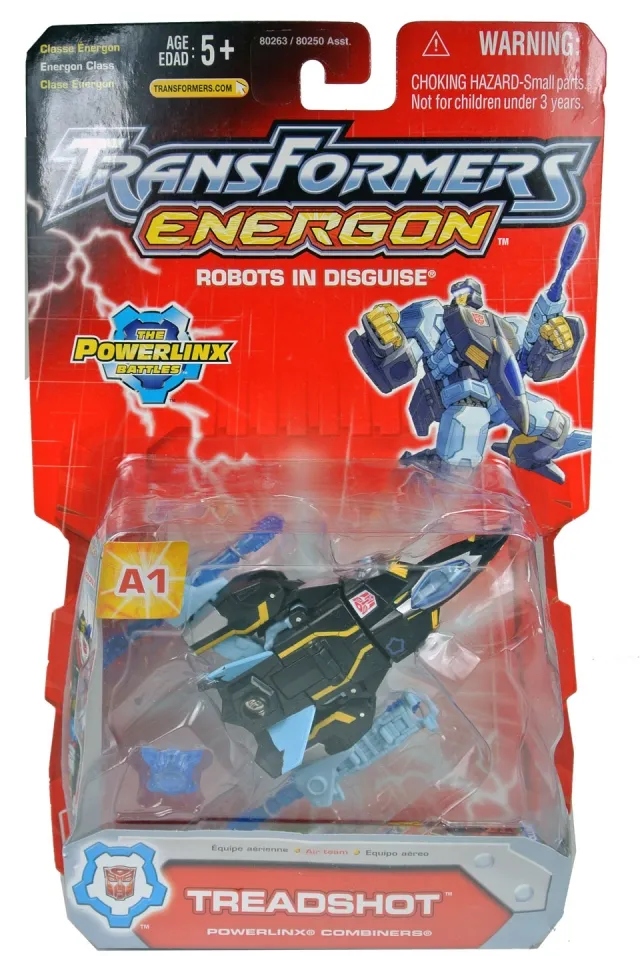 Transformers Energon Treadshot is a Basic Class scaled figure that stands 4.5-inches tall in robot mode and transforms from robot to Plane and back.