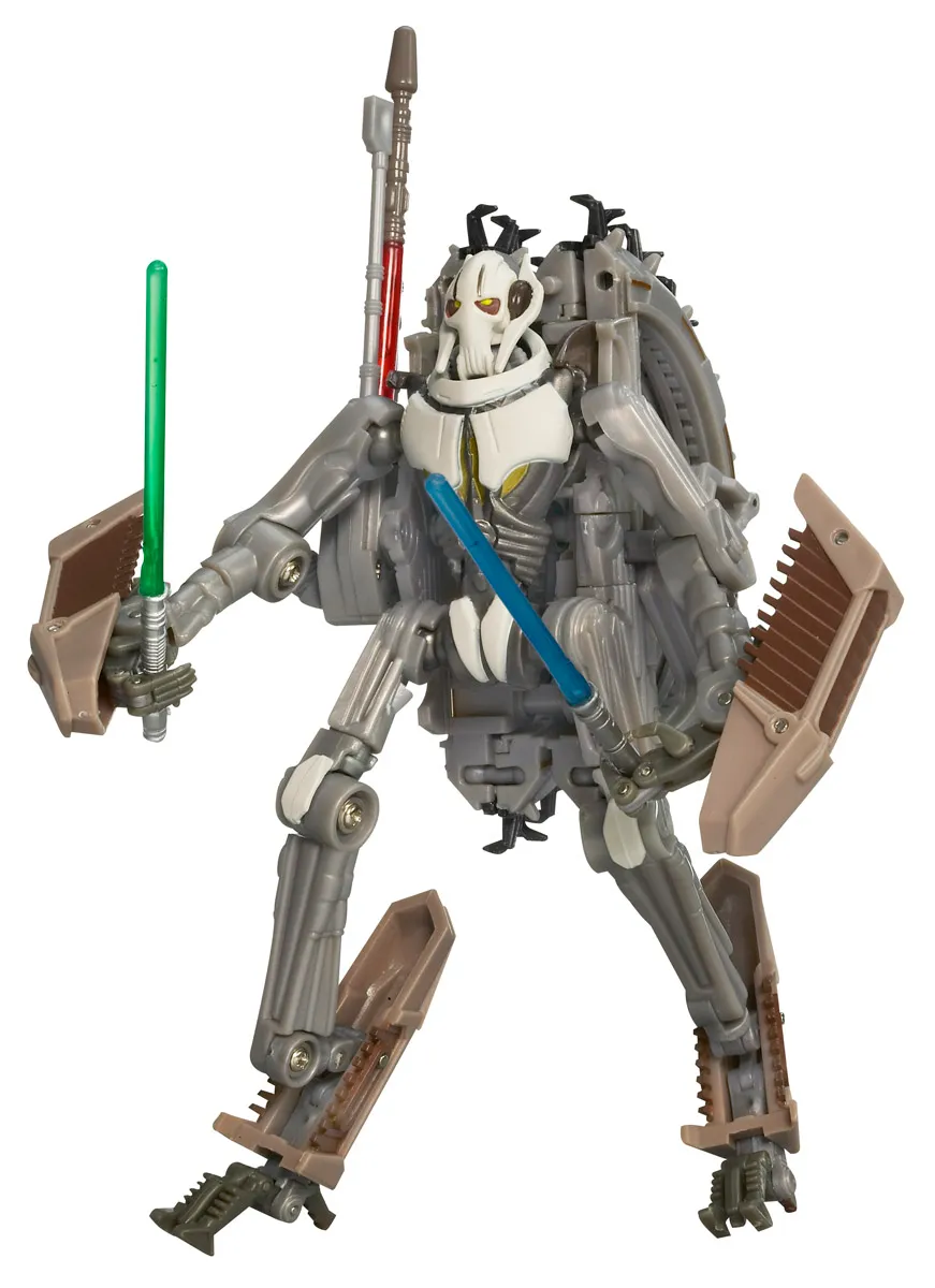 Grievous transforms into a Wheel Bike, equipped with a laser cannon and a side-mounted cockpit. He can store his two lightsabers behind his back and between the half-wheel kibble