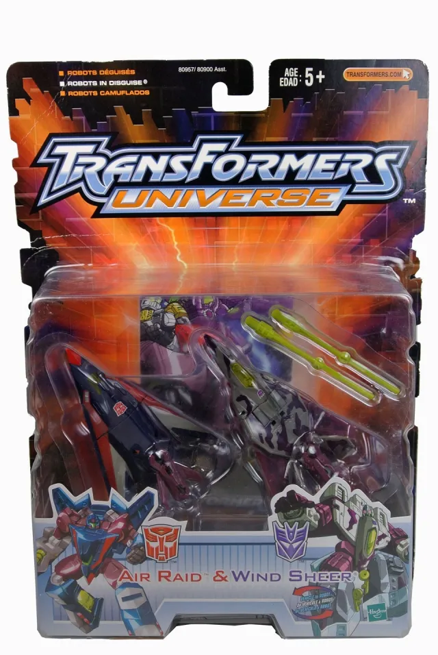 Transformers Universe Air Raid and Wind Sheer transforms from a Plane to robot and back, is a Deluxe Class-scaled figure and stands approximately 4.5-inches tall in robot mode.