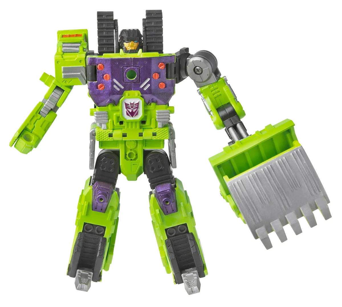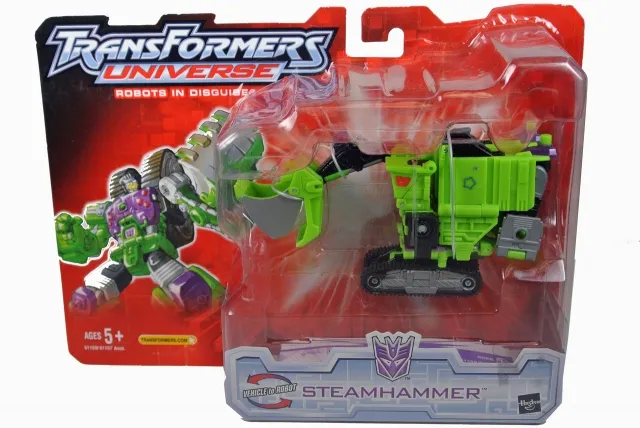 Transformers Universe Steamhammer transforms from a Front Loader to robot and back, is a Deluxe Class-scaled figure and stands approximately 6-inches tall in robot mode.