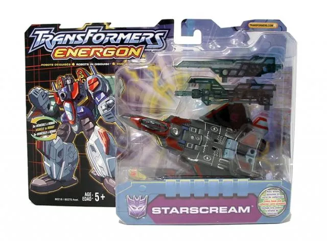Transformers Energon Starscream is a Basic Class scaled figure that stands 5.5-inches tall in robot mode and transforms from robot to Space Ship and back.