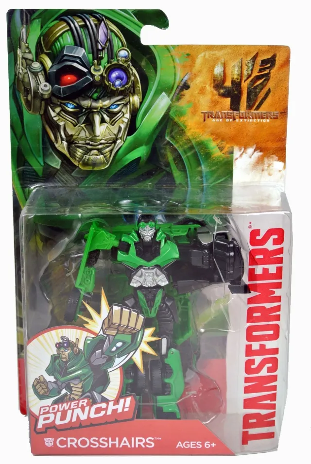 Crosshairs transforms from Corvette to robot mode in 8 easy steps. His right arm features ball-jointed articulation, while the left arm features a "power punch" gimmick, which he shares with Power Battler Bumblebee.