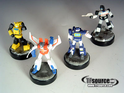 The Transformers History Collection was a set of randomly assorted figures, in blind box style packaging. 6 figures: Prime, Megatron, Starscream, Bumblebee, Jazz and Soundwave, as well as one chase figure (prime hand) were available. This lot includes 4 of the 7 figures as shown, each on a standing plate similar to a bottlecap.