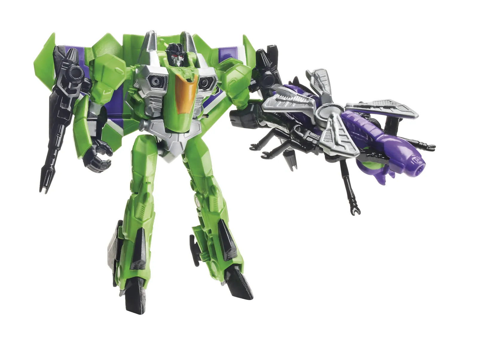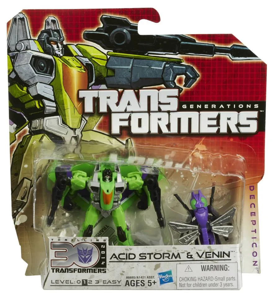 Some warriors prefer an all-out frontal assault. Acid Storm and Venin take a more treacherous approach. Acid Storm can seed the atmosphere with toxins to create metal-melting acid rain. Venin uses his stinger to poison any life form and rot them from within. It might not be as flashy as triggering an explosion, but for the evil purposes of the Decepticons, it's just as destructive. Bring some road fury to your Transformers adventures with this treacherous pair of Decepticon warrior figures! Your Acid Storm figure can take his Autobot enemies on in robot mode and then blast off to the next battle in fighter jet mode. But your Venin figure can attack in robot mode, then convert to either weapon mode or insect mode! Will the Autobots be able to handle this poisonous pair? Only you can decide! Transformers and all related terms are trademarks of Hasbro.