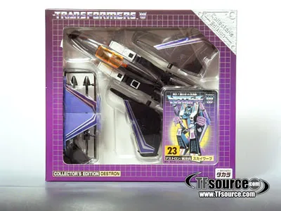 Transformers G1 23 Skywarp Convention Exclusive is now reborn into your Transformers collection reissued in all of his Generation one glory and in minty fresh condition. Included are reissues of the original weaponry and accessories included back during the original relase of Transformers G1 23 Skywarp Convention Exclusive.