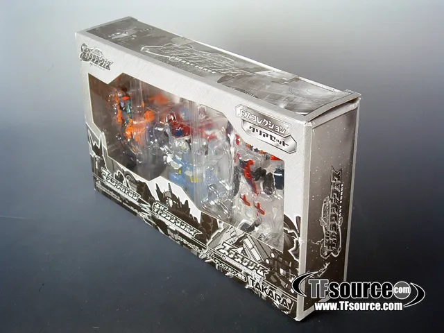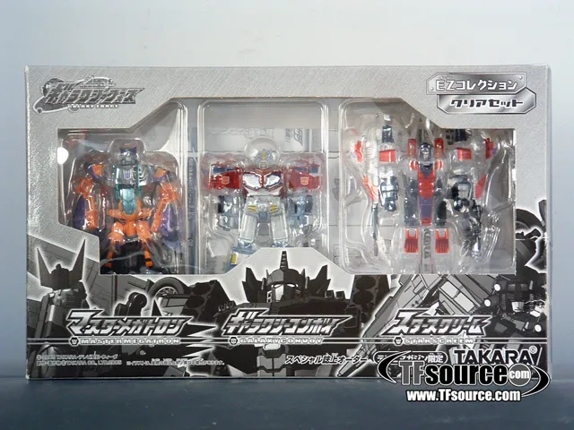 A mail in exclusive 3 pack, featuring 3 clear or crystal versions of Galaxy Convoy (aka Optimus Prime), Master Megatron and Starscream! All three figures come in all new black and white packaging, and includes translucent colored figures of Convoy, Master Megatron and starscream. A mail-in exclusive 3 pack, only available through TV Magazine of Japan in 2005, a hard to find exclusive.
