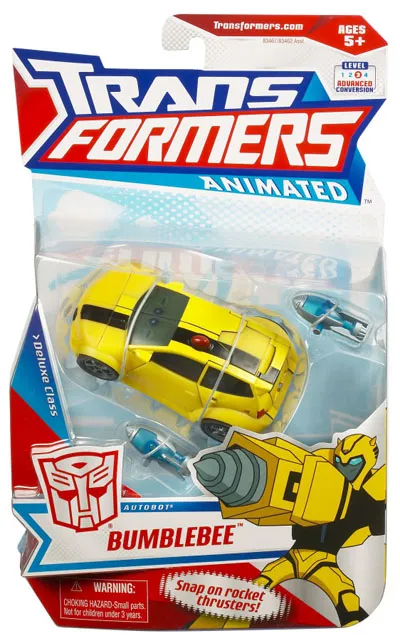 Transformers Animated Deluxe Class Bumblebee is a Deluxe Class scaled figure that stands 4-inches tall in robot mode and transforms from robot to Sports Car and back.