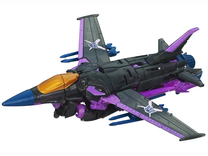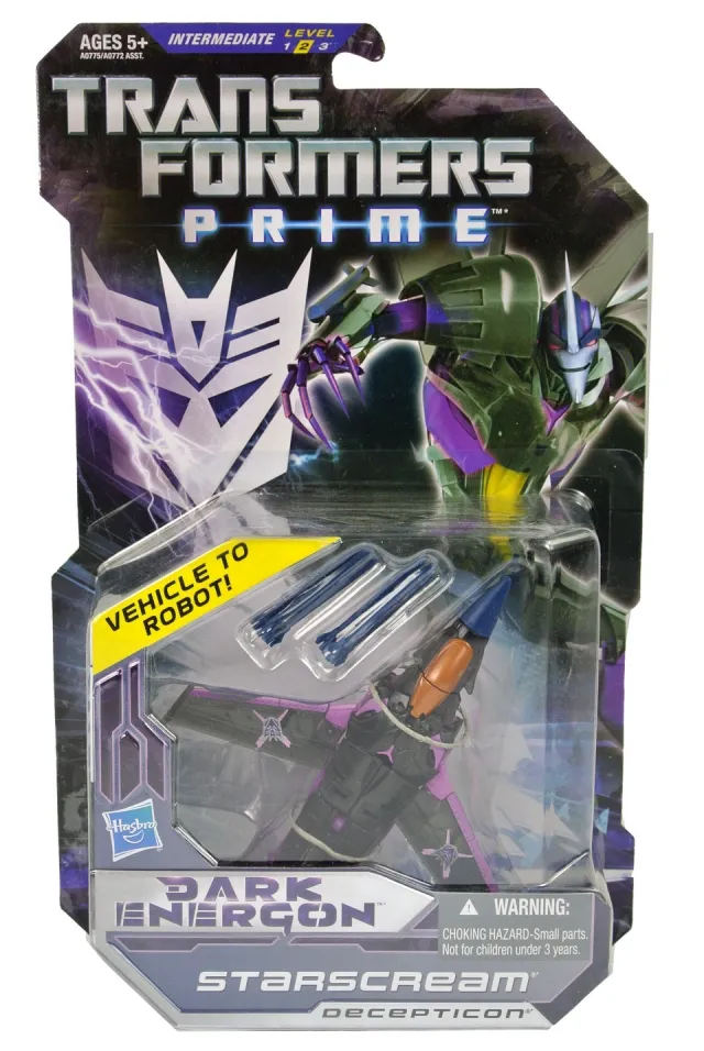 Dark Energon Starscream is exclusive redeco of "First Edition" Starscream in translucent black, opaque pink, and dark blue, as a possible homage to Skywarp.