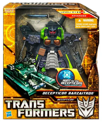 Released as part of the second wave of Transformers Voyagers class figure, Banzaitron is a purple, green and black repaint of Revenge of the Fallen Bludgeon. He transforms into a T-90 Tank. Item has been opened.