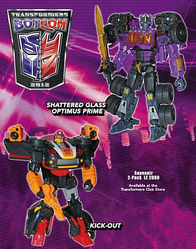 Optimus Prime and Kick-Out Shattered Glass Botcon Exclusive is a Convention Exclusive only figure only avaialble at Botcon 2012.