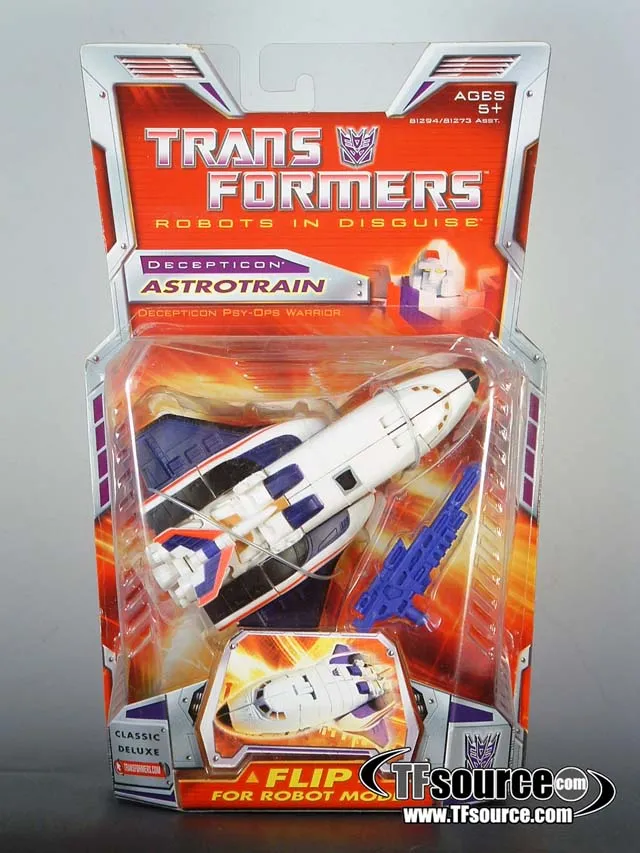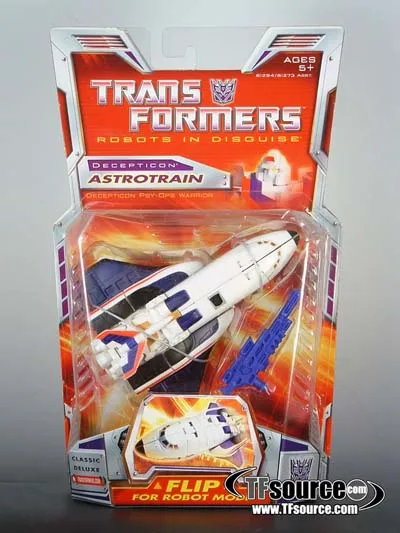Transformers Classics Robots in Disguise Deluxe Class Astrotrain transforms from a Space Shuttle to robot and back. Astrotrain is a Deluxe Class scale Transformers figure that stands approximately 6.0-inches tall in robot mode.
