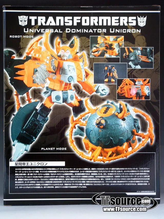 For the 2010 milestone year, Takara/Tomy is reissuing the popular Unicron Toy! The baddest of the bad is reborn in an all new and improved orange and grey more accurate color scheme and comes in amazing looking Transformers 20101 Packaging! TFsource has a limited amount of this product available.