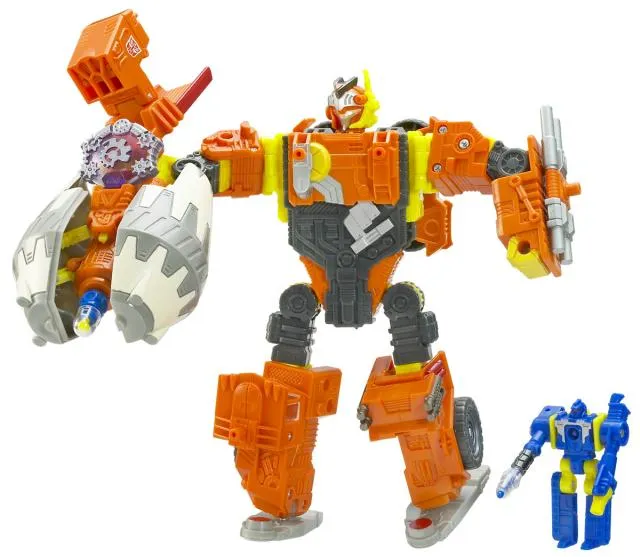 Transformers Cybertrron Quickmix and Stripmine is a Voyager Class scaled figure that stands 7-inches tall in robot mode and transforms from robot to Mixer Truck and back.