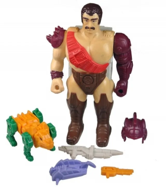 Stranglehold's inner-robot transforms into a rhino with an orange body and green limbs, while his shell resembles an intergalactic sci-fi wrestler/circus strongman.