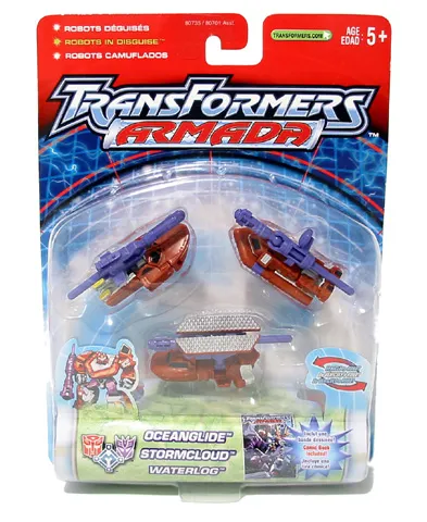 Armada (known as Micron Densetsu in Japan) was a Transformers series that ran from 2002 to 2004. Armada featured heroic Autobots and evil Decepticons doing battle on Cybertron over a race of humanoid sized partners called Mini-cons. Here is Oceanglide, Stormcloud and Waterlog from the popular Armada series!