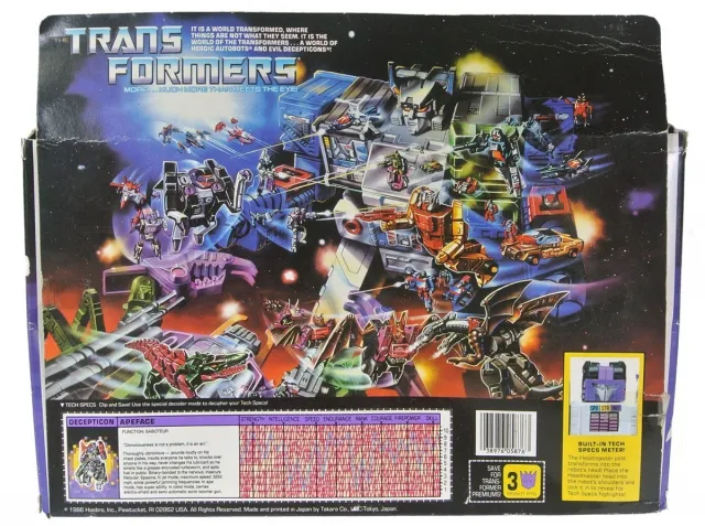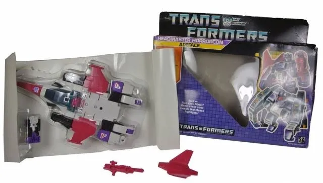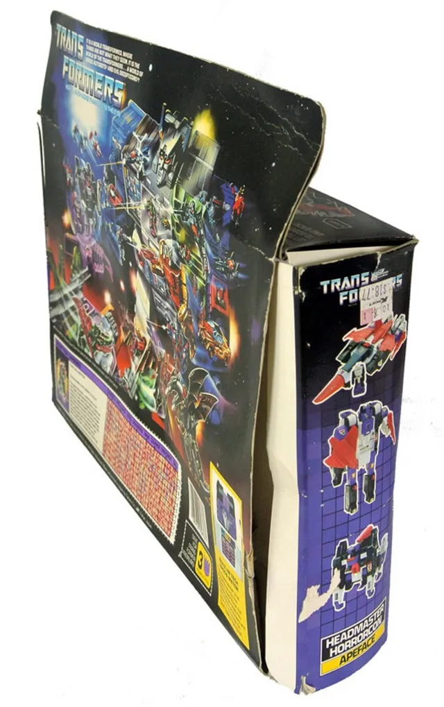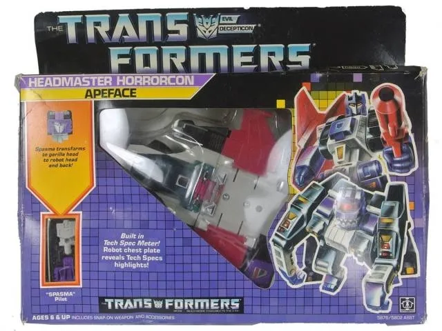 Headmaster Horrorcon Apeface enters the fray, with Decepticon Headmaster partner Spasma. A true piece of Transformers history, this is a vintage G1 piece, in great condition overall. Joints are tight, stickers show minor wear, but overall displayable condition and in C7+ condition.