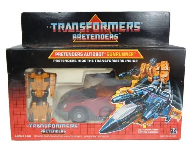 Gunrunner's inner robot transforms into a hypersonic jet. His Pretender Vehicle shell is a Cybertronic car which he can either hide inside or operate from the driver's compartment. Figure has been opened, box is in C9 condition. Figures are in excellent condition with no signs of play, paint or sticker wear. A great addition to any collection.