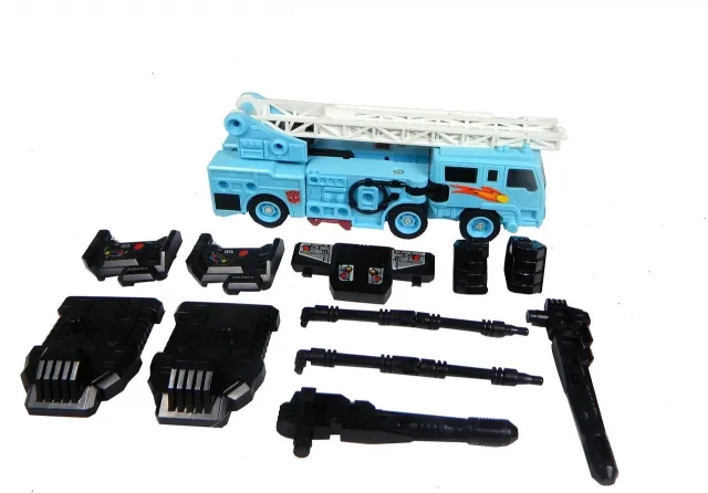 Hot Spot transforms into a blue Mitsubishi Fuso Great fire engine. As a Scramble City-style combiner torso, he has a third mode as a "repair bay", somewhat remeniscent of Powermaster Optimus Prime's combat deck. Figure is in great condition, with no signs of wear. Figure has tight joints, no stickers peeling or paint wear.