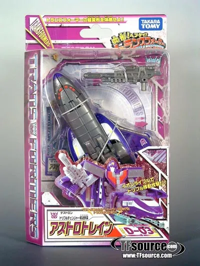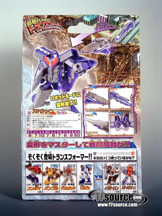 D-03 Astrotrain is part of Takara Tomy's Henkei Classics line which was available exclusively in Japan. D-03 Astrotrain is Deluxe Class-scaled, stands approximately 5-inches tall in robot mode and transforms from a Space Shuttle to robot and back.