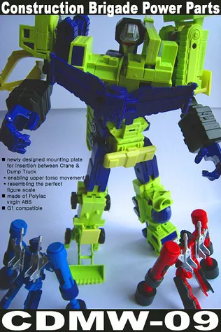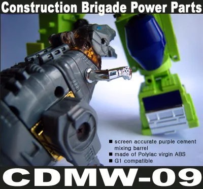 This popular set from Crazy Devy includes everything you need to soup up your G1 Devastator! Included is a screen accurate cement mixer for Mixmaster, Newly-designed mounting plate for insertion between Crane & Dump Truck - enabling upper torso movement, Shoulder brace for right arm extension - allows 45 degree inward arm movement. This is a custom piece from 3rd party maker Crazy Devy, it is not an official Hasbro or Takara/Tomy piece. However the look, feel and quality is very high, and really brings new life to a G1 Devastator.