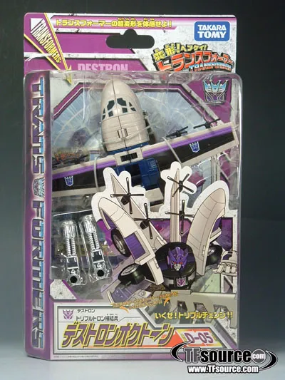 D-05 Octane is part of Takara Tomy's Henkei Classics line which was available exclusively in Japan. D-05 Octane is Deluxe Class-scaled, stands approximately 6-inches tall in robot mode and transforms from a Plane to robot and back.